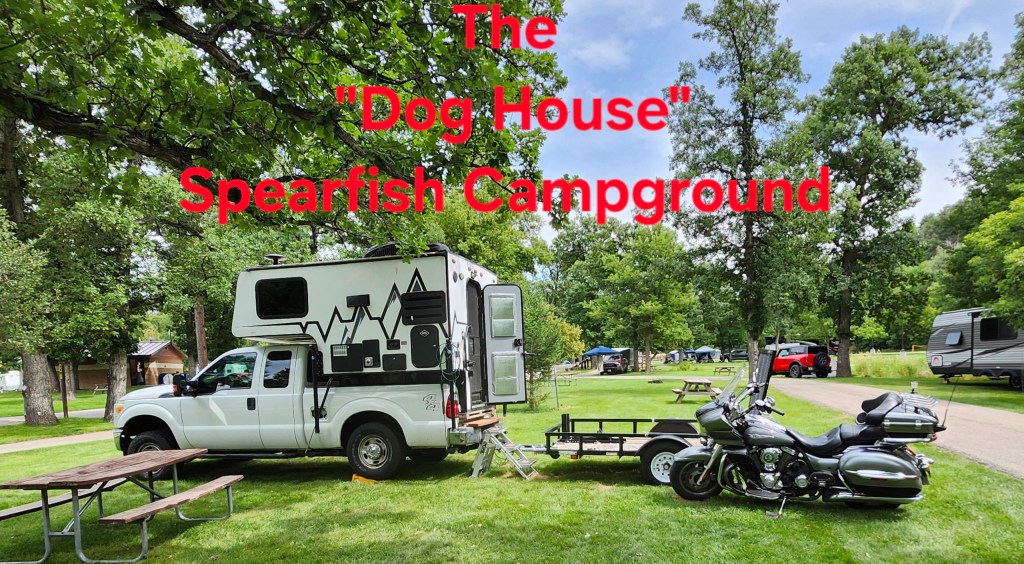 This year, I trailered the bike, because I planned to stay over after the rally to ride around and see some places and things I hadn’t been to before, mostly on the West side of the Hills. I set up my camper, the “Dog House”, at Spearfish City Campground—a peaceful and scenic spot I highly recommend.